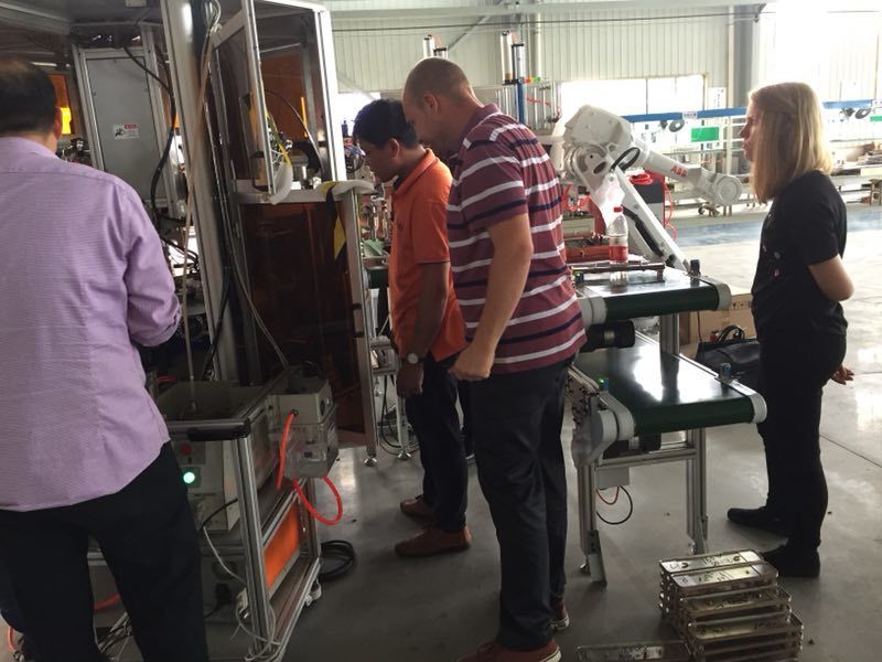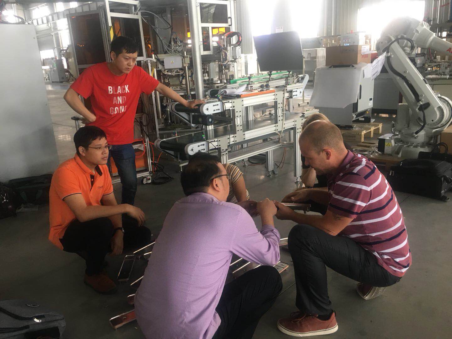 德國工程師來中國協(xié)助鎮(zhèn)江當?shù)丶缮陶{試全自動螺柱焊接換熱器生產線